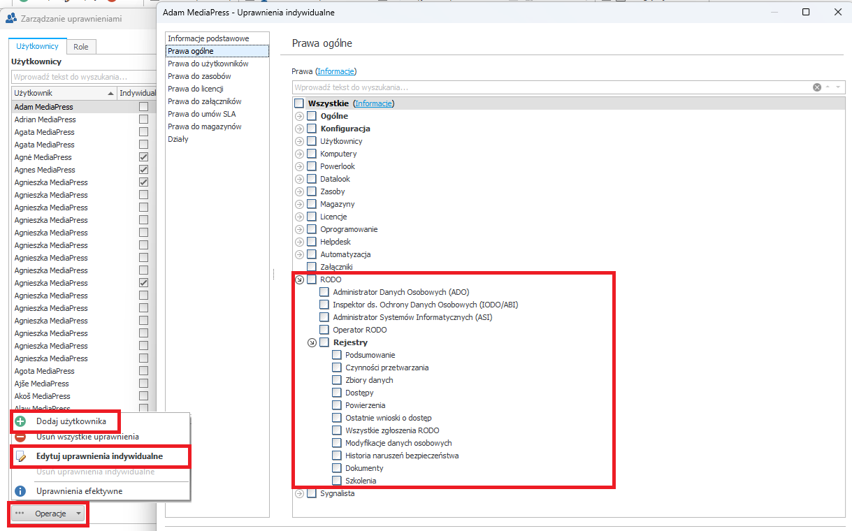 - Wybierz użytkownika, który pełni role wynikające z RODO (jeśli użytkownik nie znajduje się na liście, wybierz Operacje -> Dodaj użytkownika), edytuj jego uprawnienia indywidualne i zaznacz odpowiednie uprawnienia w sekcji praw ogólnych RODO.
