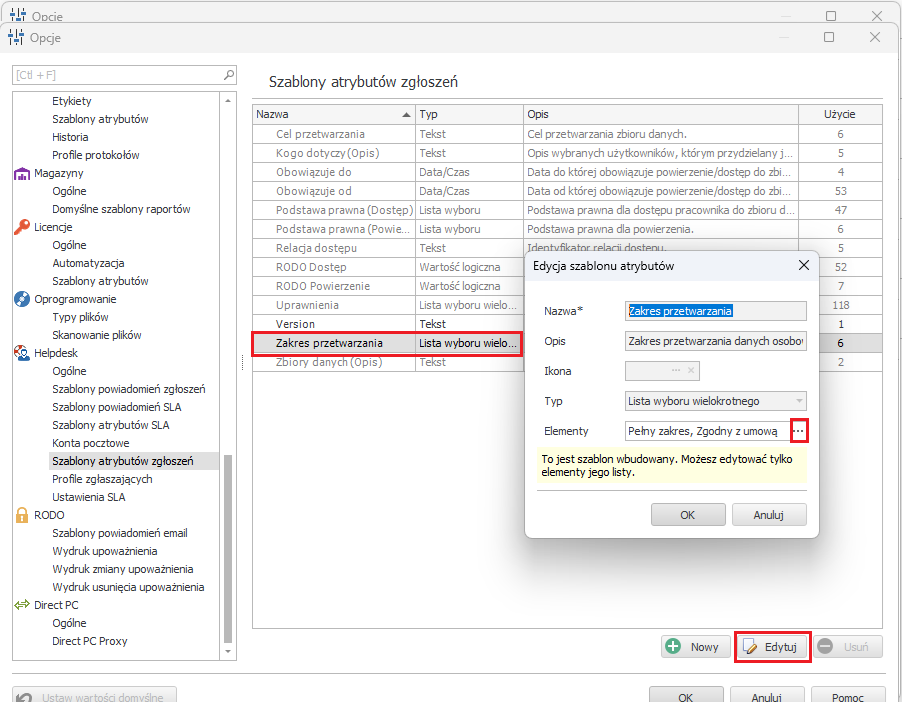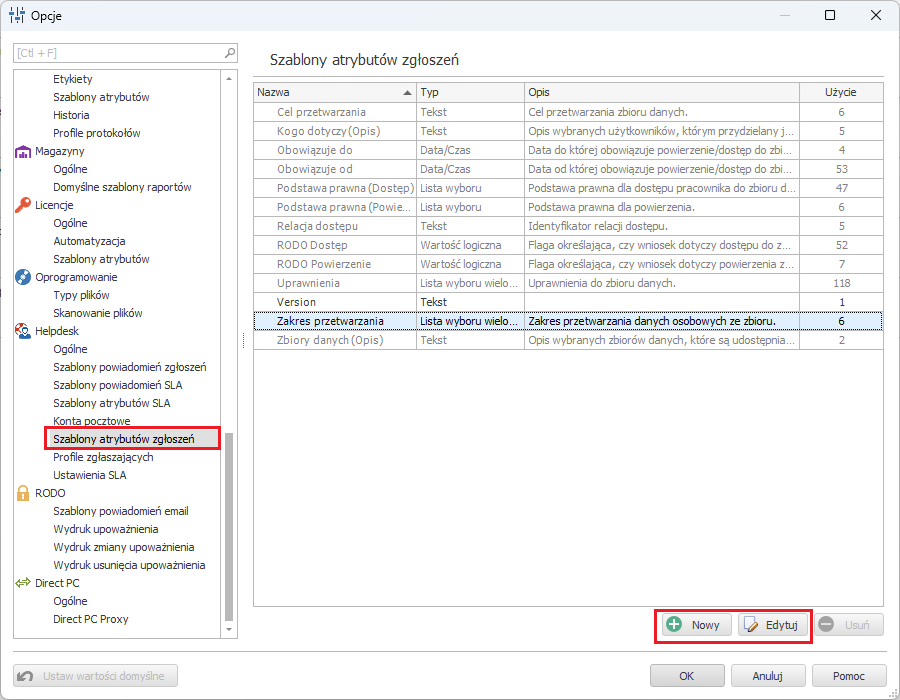 - Przejdź do menu Narzędzia -> Opcje i w zakładce Helpdesk wybierz Szablony atrybutów zgłoszeń.